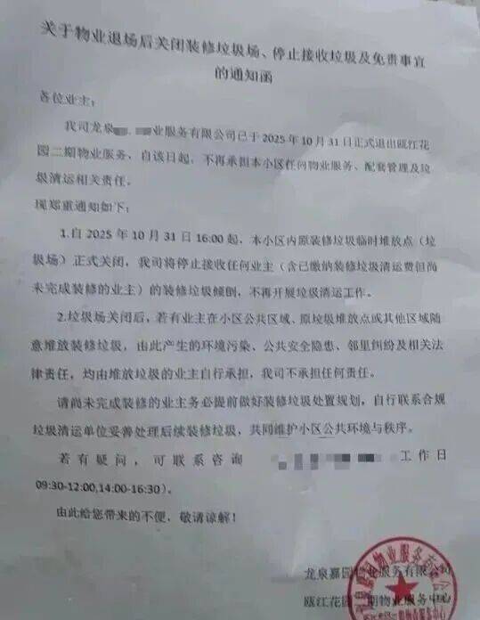 近日,浙江省龙泉市瓯江花园二期的业主们陷入了两难境地——前期服务的龙泉市嘉园物业有限公司因物业费收缴困难,2025年10月31日正式退场了。