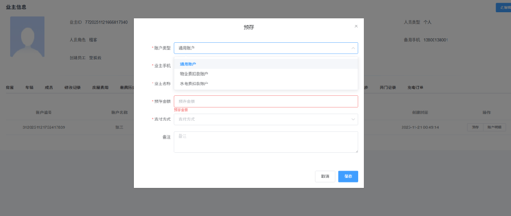 系统中,每位住户都对应唯一的预存账户,所有预存相关资金变动都集中归集至此。