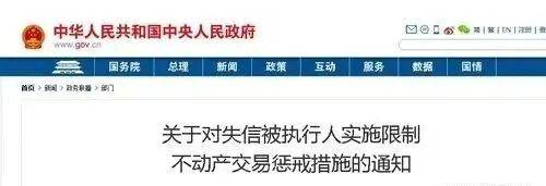 2018年3月16日,中国政府网重磅发布《关于对失信被执行人实施限制不动产交易惩戒措施的通知》,加大对失信被执行人的惩戒力度,采取限制不动产交易的惩戒措施 。