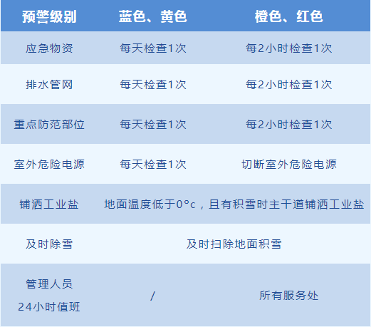 夜间降雪:值班人员在主干道和台阶等重点部位撒盐,并将门岗周边、人行道、大厅台阶积雪清扫干净。服务处负责人根据下雪量紧急通知所有工作人员提前1-2小时抵达现场进行清扫。