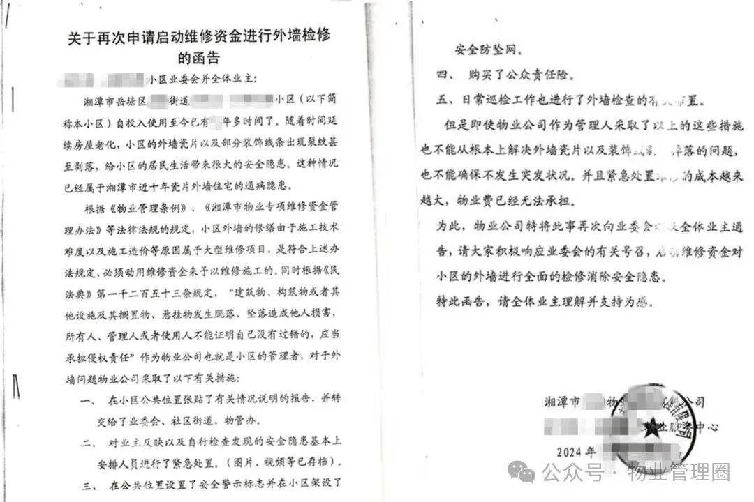 本案中,物业公司曾多次对建筑物外墙进行维修,并主动发函告知全体业主外墙瓷砖脱落的情况,号召其申请使用维修基金进行修缮,已尽到合理的注意与管理义务。